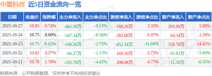 证券之星消息,截至2025年10月27日收盘,中重科技(603135)报收于10.83元,上涨0.74%,换手率1.85%,成交量4.68万手,成交额5053.82万元。