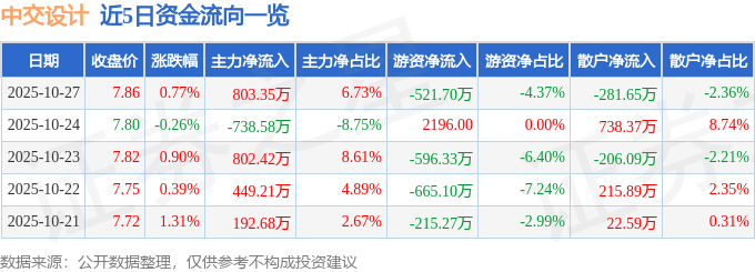 证券之星消息,截至2025年10月27日收盘,中交设计(600720)报收于7.86元,上涨0.77%,换手率1.51%,成交量15.24万手,成交额1.19亿元。