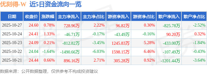 10月27日的资金流向数据方面,主力资金净流入728.96万元,占总成交额2.22%,游资资金净流入96.82万元,占总成交额0.3%,散户资金净流出825.78万元,占总成交额2.52%。