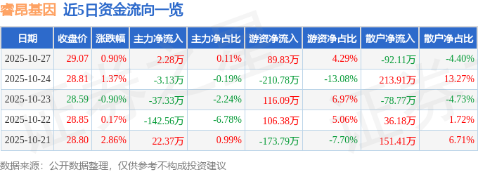证券之星消息,截至2025年10月27日收盘,睿昂基因(688217)报收于29.07元,上涨0.9%,换手率1.29%,成交量7222.0手,成交额2095.19万元。