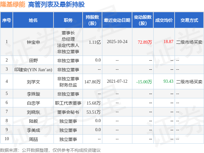 证券之星消息,根据10月27日市场公开信息、上市公司公告及交易所披露数据整理,隆基绿能(601012)最新董监高及相关人员股份变动情况:2025年10月24日公司董事钟宝申共增持公司股份72.89万股,占公司总股本为0.0096%。变动期间公司股价下跌1.05%,10月24日当日收盘报18.84元。