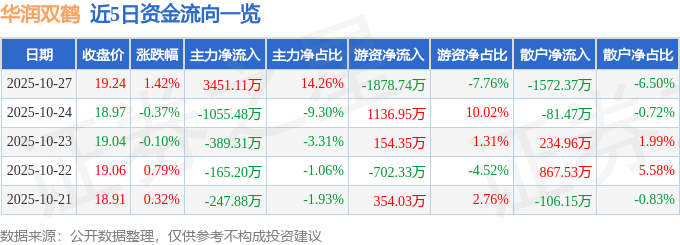 证券之星消息,截至2025年10月27日收盘,华润双鹤(600062)报收于19.24元,上涨1.42%,换手率1.22%,成交量12.62万手,成交额2.42亿元。