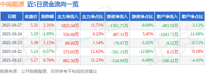 证券之星消息,截至2025年10月27日收盘,中闽能源(600163)报收于5.32元,上涨2.31%,换手率1.57%,成交量29.79万手,成交额1.58亿元。