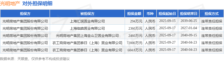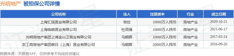 光明地产10月24日披露5笔对外担保,被担保公司4家。对外担保明细如下表: