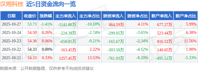 证券之星消息,截至2025年10月27日收盘,汉朔科技(301275)报收于53.73元,下跌1.41%,换手率6.2%,成交量2.09万手,成交额1.13亿元。