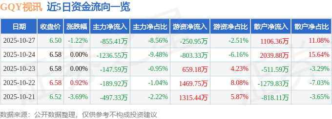 证券之星消息,截至2025年10月27日收盘,GQY视讯(300076)报收于6.5元,下跌1.22%,换手率3.63%,成交量15.38万手,成交额9989.3万元。