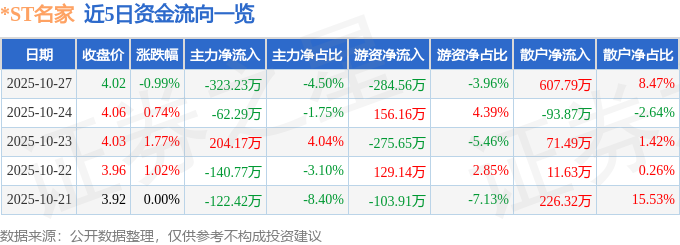 证券之星消息,截至2025年10月27日收盘,*ST名家(300506)报收于4.02元,下跌0.99%,换手率2.67%,成交量17.45万手,成交额7177.67万元。