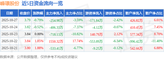 10月27日的资金流向数据方面,主力资金净流出254.98万元,占总成交额3.59%,游资资金净流出171.84万元,占总成交额2.42%,散户资金净流入426.82万元,占总成交额6.01%。