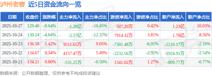 证券之星消息,截至2025年10月27日收盘,泸州老窖(000568)报收于129.4元,下跌0.64%,换手率0.64%,成交量9.42万手,成交额12.22亿元。
