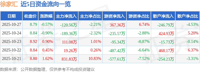 证券之星消息,截至2025年10月27日收盘,徐家汇(002561)报收于8.79元,下跌0.57%,换手率1.5%,成交量6.2万手,成交额5453.44万元。