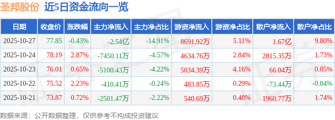 10月27日的资金流向数据方面,主力资金净流出2.54亿元,占总成交额14.91%,游资资金净流入8691.92万元,占总成交额5.11%,散户资金净流入1.67亿元,占总成交额9.8%。