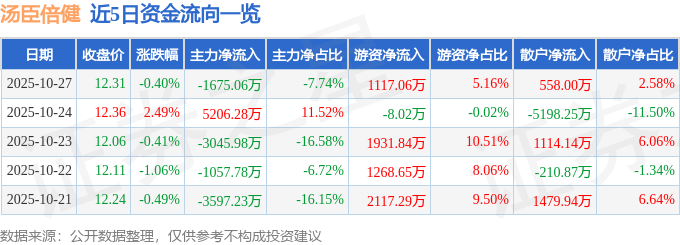 证券之星消息,截至2025年10月27日收盘,汤臣倍健(300146)报收于12.31元,下跌0.4%,换手率1.57%,成交量17.58万手,成交额2.16亿元。