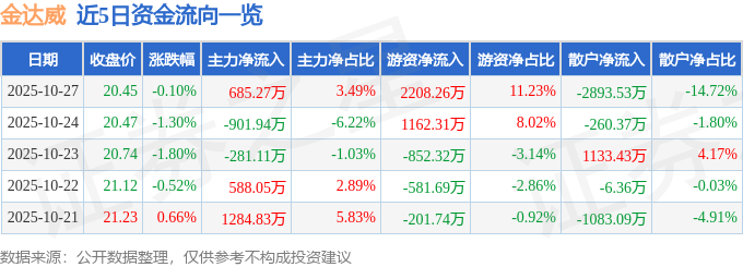 10月27日的资金流向数据方面,主力资金净流入685.27万元,占总成交额3.49%,游资资金净流入2208.26万元,占总成交额11.23%,散户资金净流出2893.53万元,占总成交额14.72%。