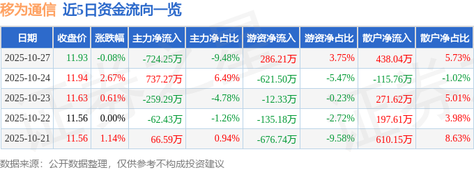 证券之星消息,截至2025年10月27日收盘,移为通信(300590)报收于11.93元,下跌0.08%,换手率1.81%,成交量6.42万手,成交额7639.2万元。