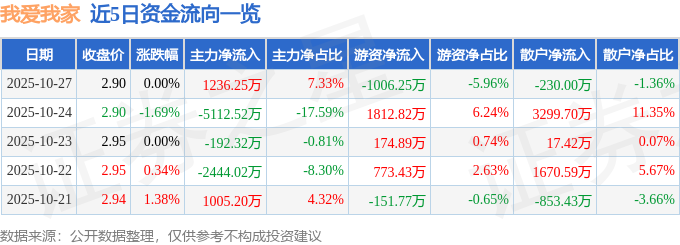 证券之星消息,截至2025年10月27日收盘,我爱我家(000560)报收于2.9元,上涨0.0%,换手率2.58%,成交量58.26万手,成交额1.69亿元。