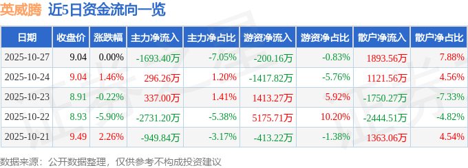 10月27日的资金流向数据方面,主力资金净流出1693.4万元,占总成交额7.05%,游资资金净流出200.16万元,占总成交额0.83%,散户资金净流入1893.56万元,占总成交额7.88%。