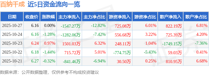 证券之星消息,截至2025年10月27日收盘,百纳千成(300291)报收于6.16元,上涨0.0%,换手率2.1%,成交量19.54万手,成交额1.21亿元。