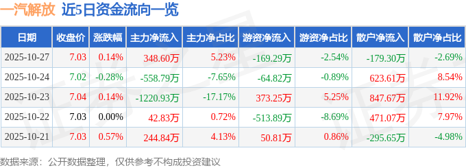证券之星消息,截至2025年10月27日收盘,一汽解放(000800)报收于7.03元,上涨0.14%,换手率0.19%,成交量9.48万手,成交额6666.28万元。