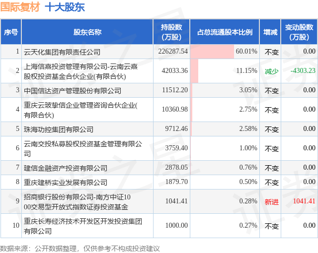 证券之星消息,10月27日国际复材发布公告《国际复材:重庆国际复合材料股份有限公司简式权益变动报告书》,其股东上海信熹投资管理有限公司-云南云熹股权投资基金合伙企业(有限合伙)于2025年10月15日至2025年10月27日间合计减持1086.04万股,占公司目前总股本的0.288%,变动期间该股股价上涨4.64%,截止10月27日收盘报6.31元。