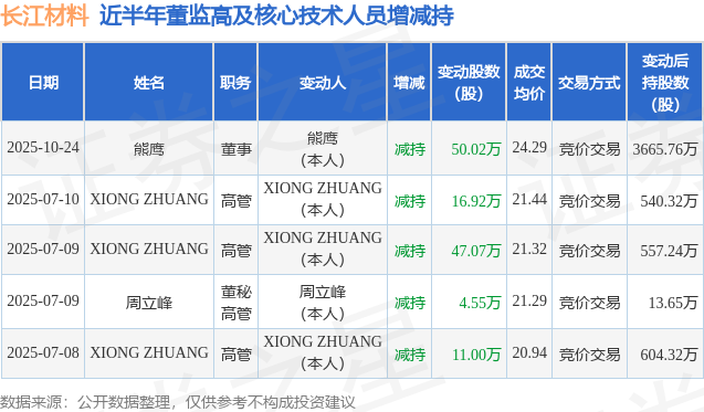 长江材料近半年内的董监高及核心技术人员增减持详情如下: