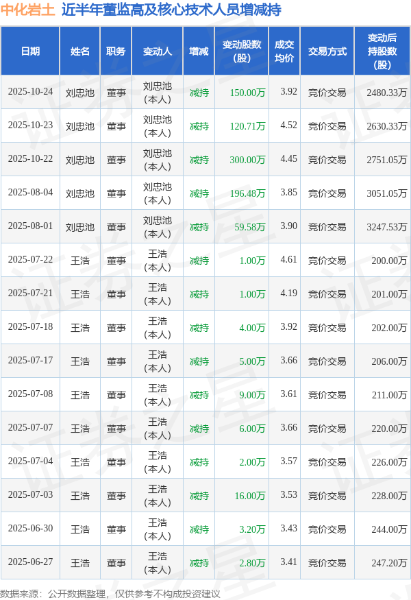 中化岩土近半年内的董监高及核心技术人员增减持详情如下: