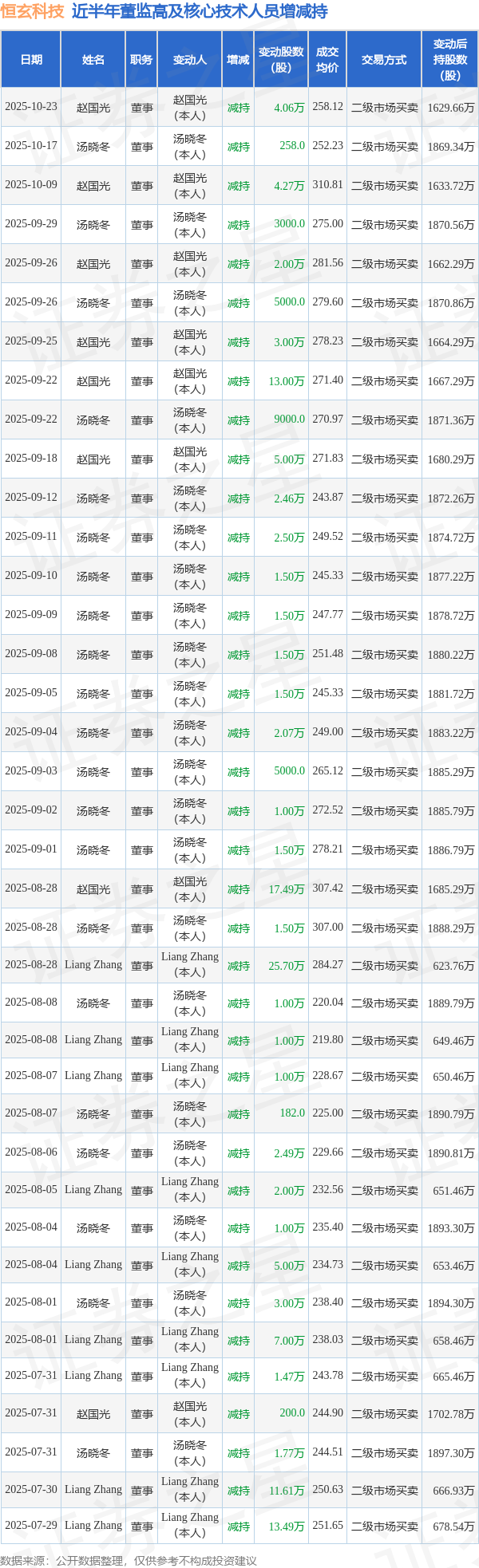恒玄科技近半年内的董监高及核心技术人员增减持详情如下: