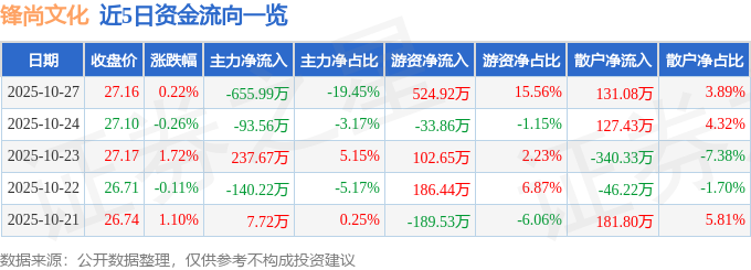 证券之星消息,截至2025年10月27日收盘,锋尚文化(300860)报收于27.16元,上涨0.22%,换手率1.11%,成交量1.25万手,成交额3373.02万元。