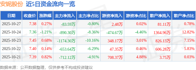证券之星消息,截至2025年10月27日收盘,安妮股份(002235)报收于7.38元,上涨0.27%,换手率2.54%,成交量14.09万手,成交额1.04亿元。