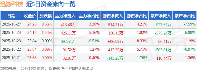 证券之星消息,截至2025年10月27日收盘,迅游科技(300467)报收于24.26元,上涨0.33%,换手率2.96%,成交量4.99万手,成交额1.22亿元。