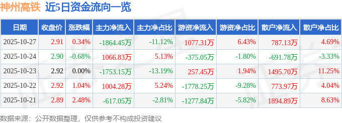 证券之星消息,截至2025年10月27日收盘,神州高铁(000008)报收于2.91元,上涨0.34%,换手率2.13%,成交量57.95万手,成交额1.68亿元。