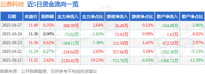 10月27日的资金流向数据方面,主力资金净流入308.39万元,占总成交额2.64%,游资资金净流入26.49万元,占总成交额0.23%,散户资金净流出334.88万元,占总成交额2.86%。
