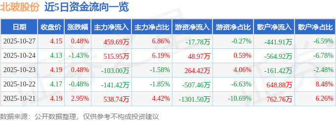 证券之星消息,截至2025年10月27日收盘,北玻股份(002613)报收于4.15元,上涨0.48%,换手率2.1%,成交量16.24万手,成交额6702.32万元。
