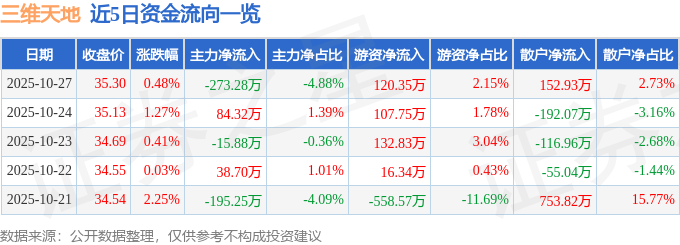 证券之星消息,截至2025年10月27日收盘,三维天地(301159)报收于35.3元,上涨0.48%,换手率3.01%,成交量1.6万手,成交额5600.46万元。