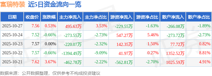 10月27日的资金流向数据方面,主力资金净流入495.63万元,占总成交额3.53%,游资资金净流出229.55万元,占总成交额1.63%,散户资金净流出266.08万元,占总成交额1.89%。