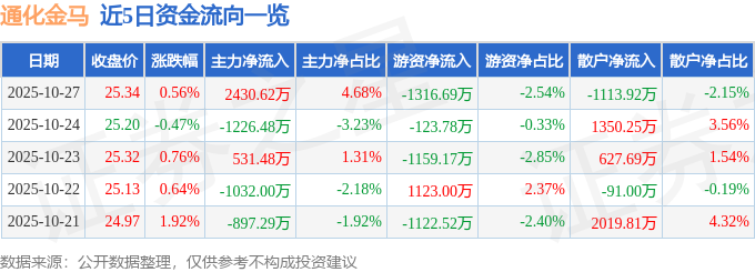 证券之星消息,截至2025年10月27日收盘,通化金马(000766)报收于25.34元,上涨0.56%,换手率2.13%,成交量20.55万手,成交额5.19亿元。