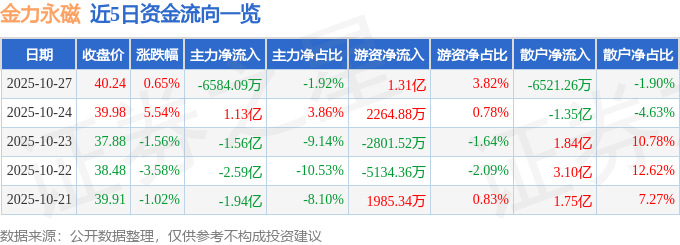 证券之星消息,截至2025年10月27日收盘,金力永磁(300748)报收于40.24元,上涨0.65%,换手率7.45%,成交量84.22万手,成交额34.27亿元。
