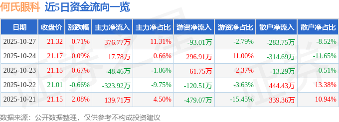 证券之星消息,截至2025年10月27日收盘,何氏眼科(301103)报收于21.32元,上涨0.71%,换手率0.99%,成交量1.56万手,成交额3330.12万元。