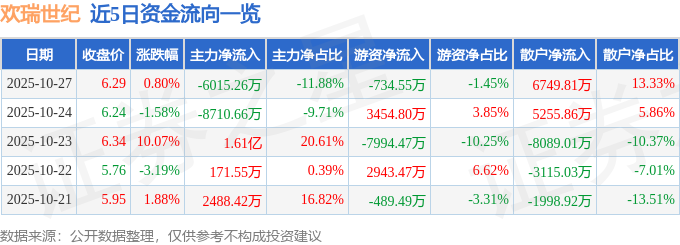 证券之星消息,截至2025年10月27日收盘,欢瑞世纪(000892)报收于6.29元,上涨0.8%,换手率11.23%,成交量79.85万手,成交额5.06亿元。