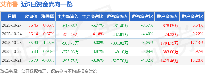证券之星消息,截至2025年10月27日收盘,艾布鲁(301259)报收于36.45元,上涨0.86%,换手率2.98%,成交量2.95万手,成交额1.07亿元。