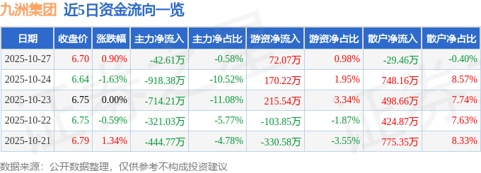 证券之星消息,截至2025年10月27日收盘,九洲集团(300040)报收于6.7元,上涨0.9%,换手率2.12%,成交量10.95万手,成交额7322.25万元。