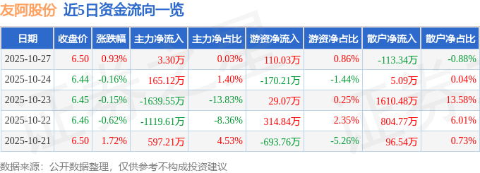 证券之星消息,截至2025年10月27日收盘,友阿股份(002277)报收于6.5元,上涨0.93%,换手率1.42%,成交量19.75万手,成交额1.28亿元。