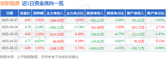 证券之星消息,截至2025年10月27日收盘,宝新能源(000690)报收于4.81元,上涨1.05%,换手率2.22%,成交量48.23万手,成交额2.32亿元。