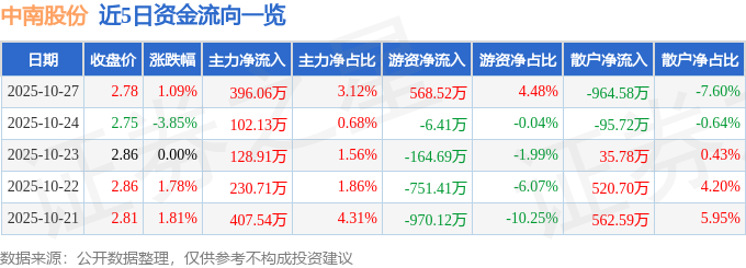 证券之星消息,截至2025年10月27日收盘,中南股份(000717)报收于2.78元,上涨1.09%,换手率1.89%,成交量45.69万手,成交额1.27亿元。