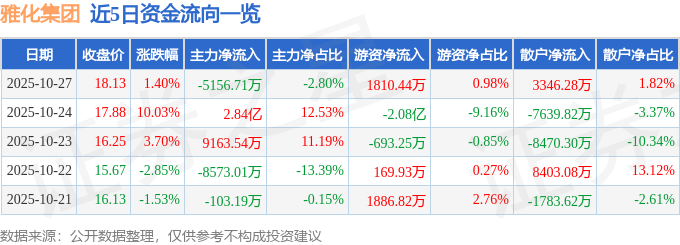 证券之星消息,截至2025年10月27日收盘,雅化集团(002497)报收于18.13元,上涨1.4%,换手率9.63%,成交量101.93万手,成交额18.39亿元。