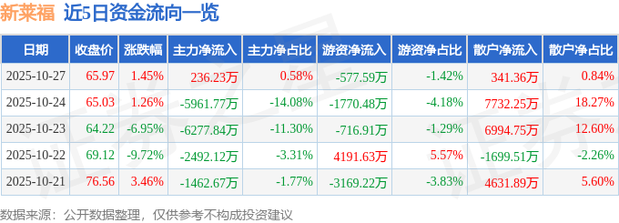 证券之星消息,截至2025年10月27日收盘,新莱福(301323)报收于65.97元,上涨1.45%,换手率9.17%,成交量6.15万手,成交额4.07亿元。