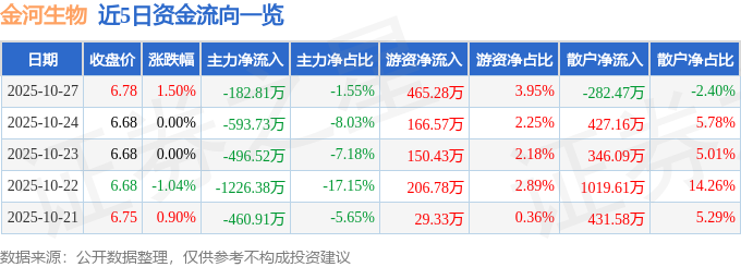 证券之星消息,截至2025年10月27日收盘,金河生物(002688)报收于6.78元,上涨1.5%,换手率2.33%,成交量17.42万手,成交额1.18亿元。