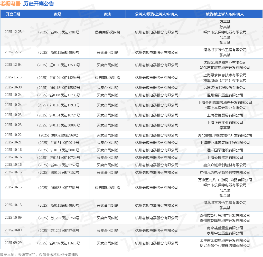 案号:(2025)浙0113民初15567号根据统计,近一年内以杭州老板电器股份有限公司为当事人的历史开庭公告有229则,其中案由为“买卖合同纠纷”的公告以149则居首,其次为“侵害商标权纠纷”有45则,“承揽合同纠纷”有5则。历史开庭公告(前20条)如下: