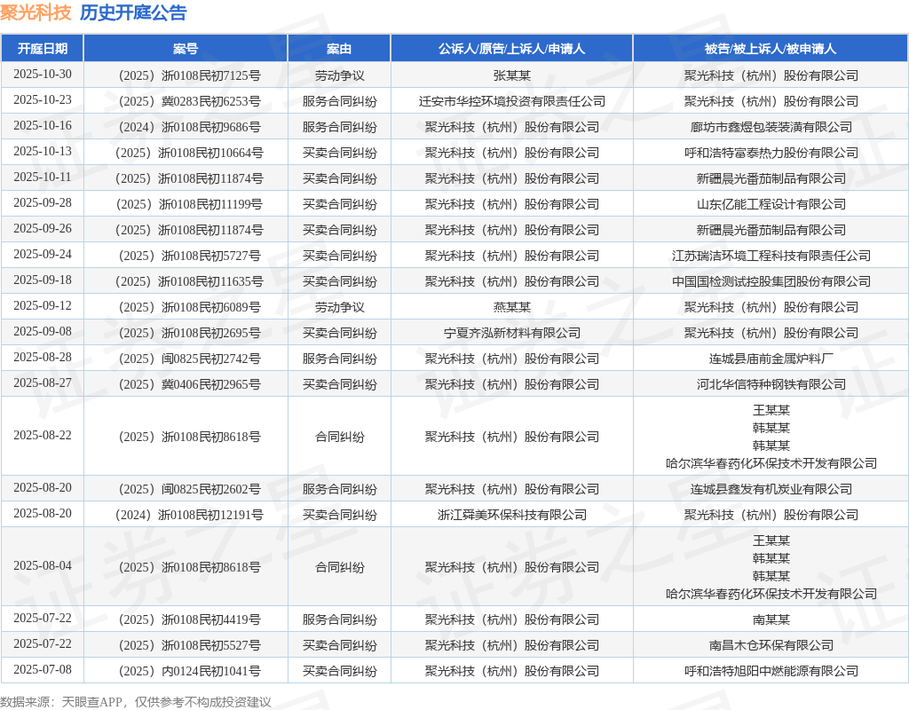 案号:(2025)浙0108民初7125号根据统计,近一年内以聚光科技(杭州)股份有限公司为当事人的历史开庭公告有49则,其中案由为“买卖合同纠纷”的公告以25则居首,其次为“服务合同纠纷”有15则,“合同纠纷”有5则。历史开庭公告(前20条)如下: