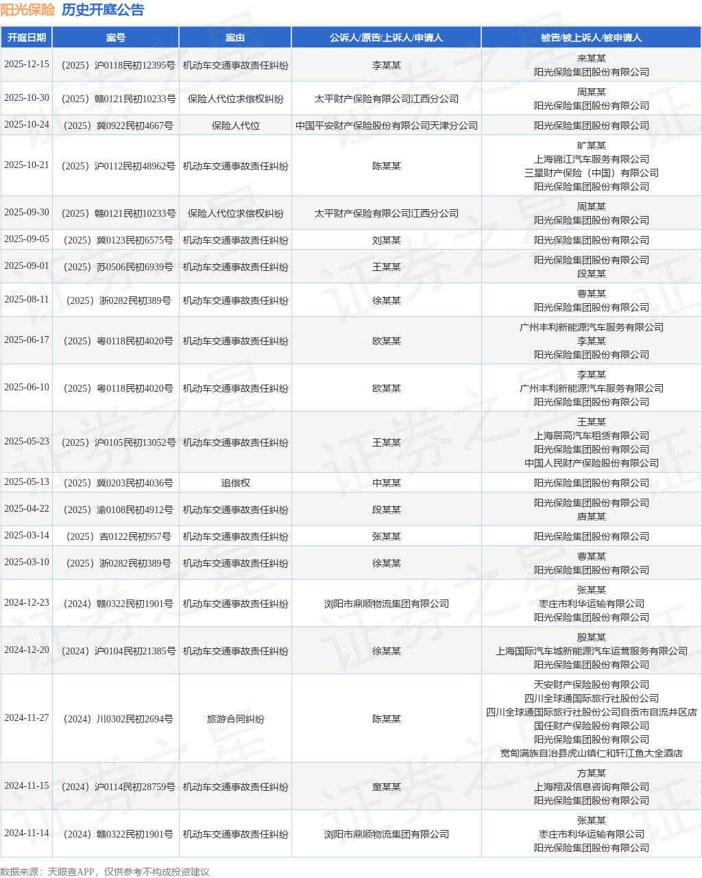 案号:(2025)赣0121民初10233号根据统计,近一年内以阳光保险集团股份有限公司为当事人的历史开庭公告有20则,其中案由为“机动车交通事故责任纠纷”的公告以15则居首,其次为“保险人代位求偿权纠纷”有2则,“保险人代位”有1则。历史开庭公告如下: