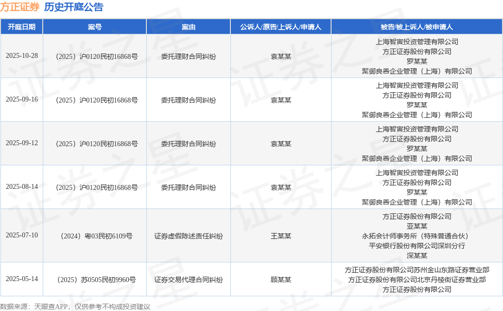 案号:(2025)沪0120民初16868号根据统计,近一年内以方正证券股份有限公司为当事人的历史开庭公告有6则,其中案由为“委托理财合同纠纷”的公告以4则居首,其次为“证券交易代理合同纠纷”有1则,“证券虚假陈述责任纠纷”有1则。历史开庭公告如下: